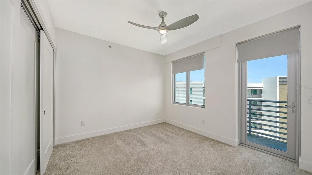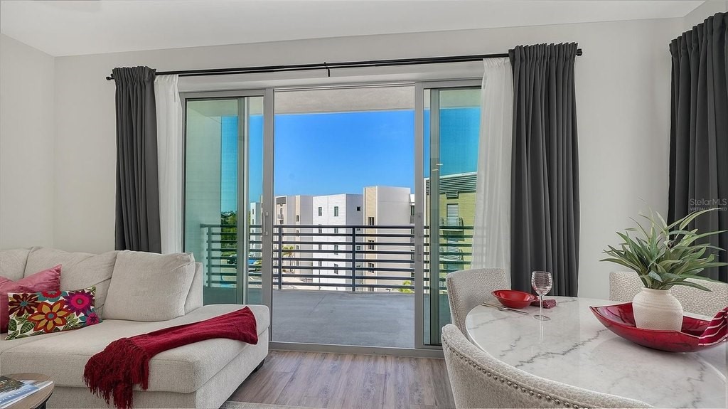 One or more photo(s) has been virtually staged. The west porch and 2 bedrooms have been virtually staged. Fabulous opportunity to own this rarely available END condominium, a light and bright penthouse in The Strand, a waterfront community just minutes from Downtown, Sarasota's vibrant arts, culture, dining, shopping and the new Bay Front area/entertainment. Largest floor plan available. Perfect winter home, investment property or permanent residence. High gloss cabinetry in kitchen & baths. Light quartz counters in the kitchen and baths. Open concept living/ dining area for easy entertaining which leads directly onto your spacious balcony from which you will see evening sunsets. This condo has an assigned garage parking spot and storage cage. Newer construction as of 2022, and built to the latest hurricane codes. Impact sliders and windows throughout. Low maintenance fees, generous rental policy (1 week minimum/ 52 times/year) and a dog friendly gated community. Several EV charging stations are available along with plenty of guest parking. Amenities include heated pool, spa, gas grills, fitness center, fire pit, kayak launch, dog park, on-site property manager (M-F) and so much more, a must see. The Strand consists of 2 buildings, total of 152 units, and 47 boat slips which can be purchased when available if one does own in The Strand.